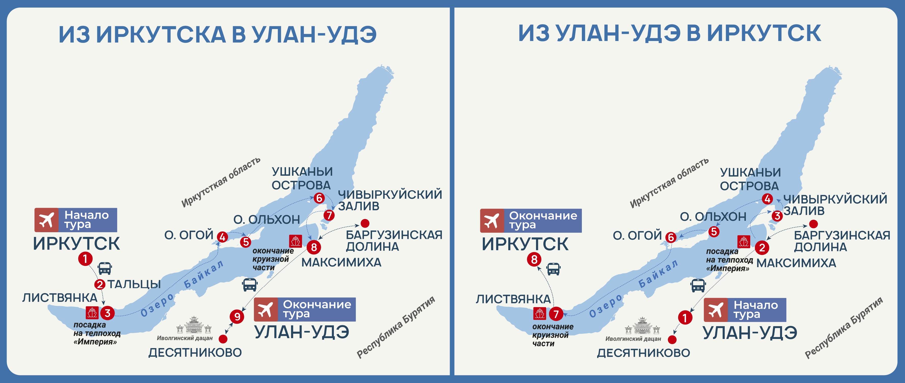 За 8 дней круизного тура вы узнаете Байкал во всем его разнообразии, посетив обе стороны Байкала – Западную и Восточную, и два современных региона – Иркутскую область и Республику Бурятию.