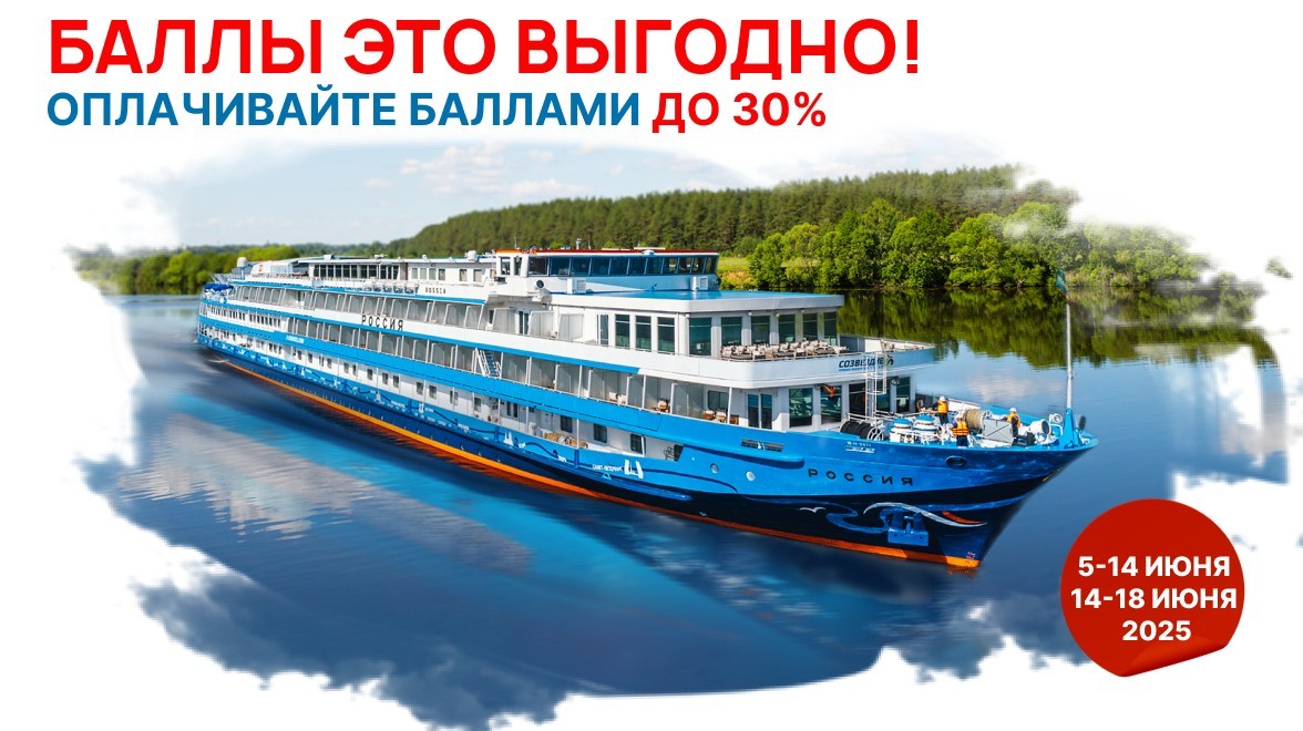 Только для двух круизов навигации 2025 действует оплата баллами – до 30% от стоимости круиза!