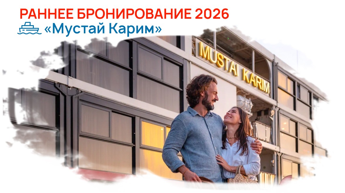 Мечтаете о незабываемом путешествии? Оно ждет вас в круизах класса «Люкс» на теплоходе «Мустай Карим». На сегодня это самый большой и новый теплоход на российском рынке речных круизов. Продажи круизов 2026 открыты! С апреля по ноябрь для вас: