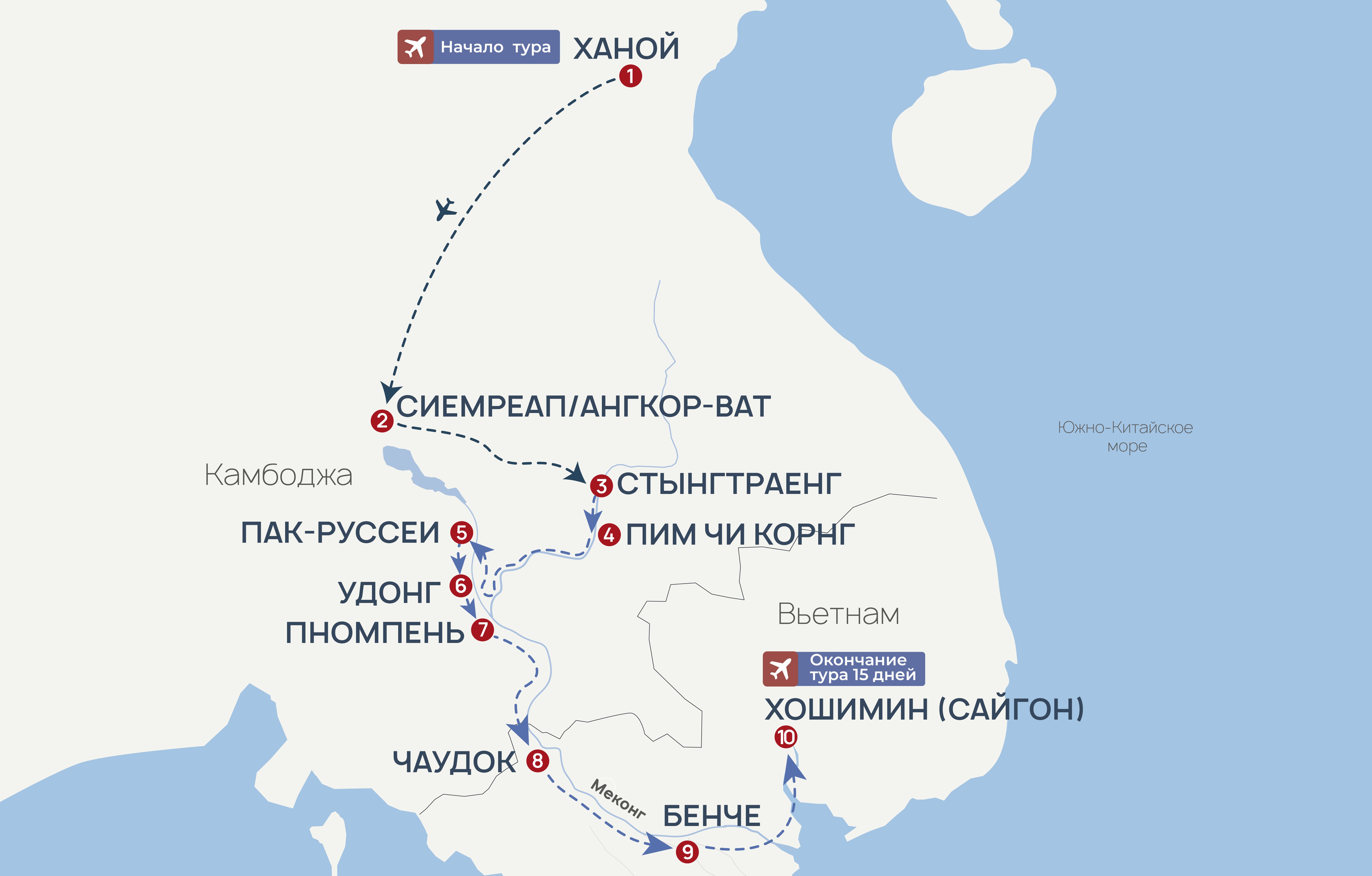 Круизы по Меконгу – это возможность увидеть аутентичную сельскую жизнь Вьетнама и Камбоджи, плавучие рынки и ремесленные деревни, древние храмы и тропические ландшафты, а также вас ждут: