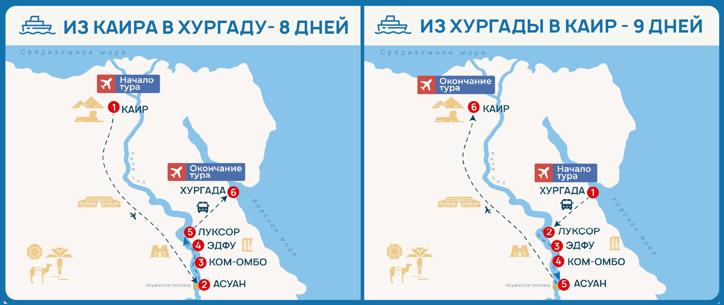 Вы можете выбрать как 8-дневный круизный тур – от Каира до Хургады (3 ночи в круизе по Нилу), так и 9-дневный - от Хургады до Каира(4 ночи в круизе по Нилу):