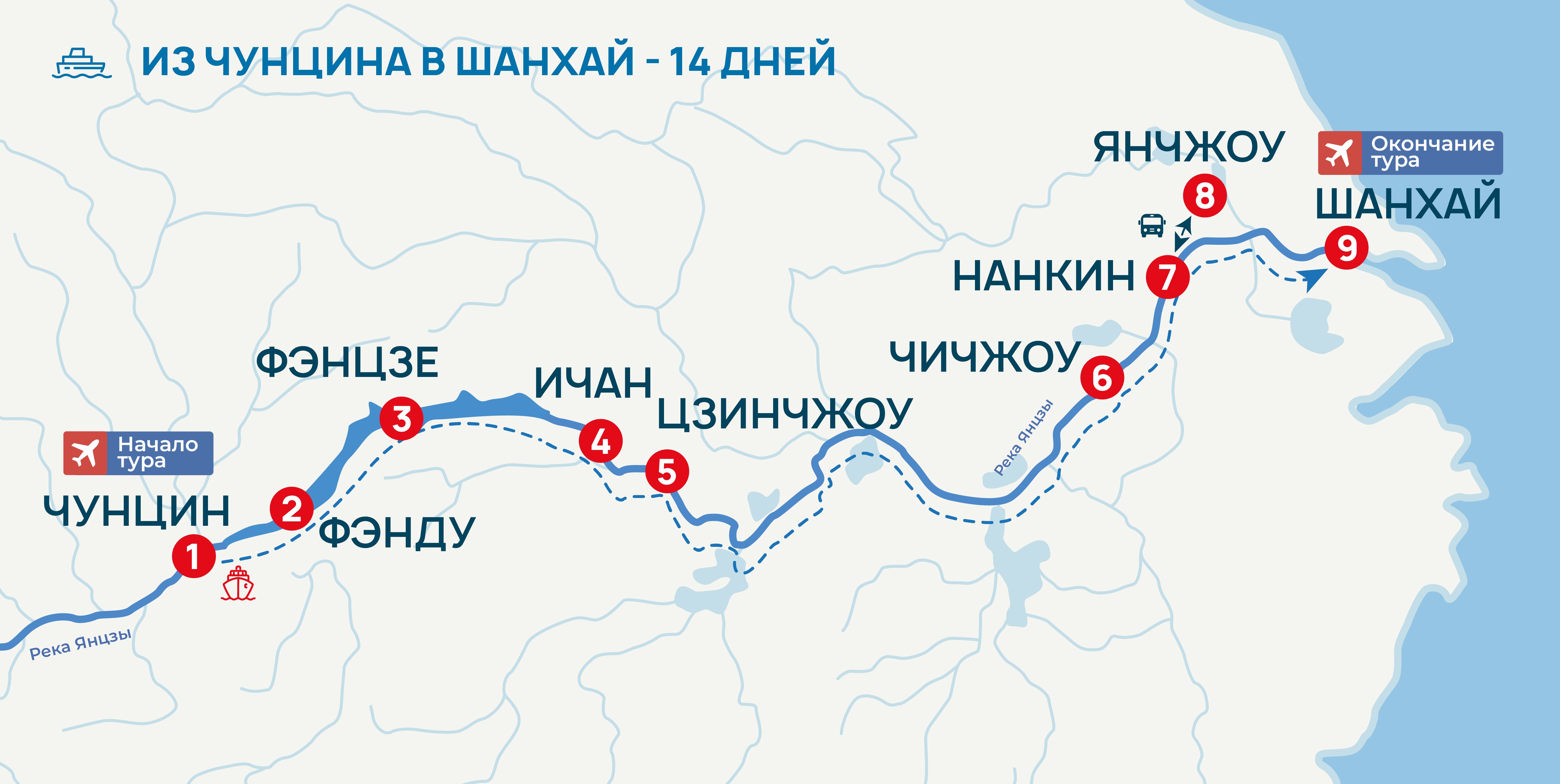 14-дневный круизный тур из Чунцина в Шанхай включает в себя 11 дней круиза на теплоходе Century Legend 5* по всей судоходной части Янцзы, а также небольшую до- и после круизную программу в Чунцине и Шанхае.