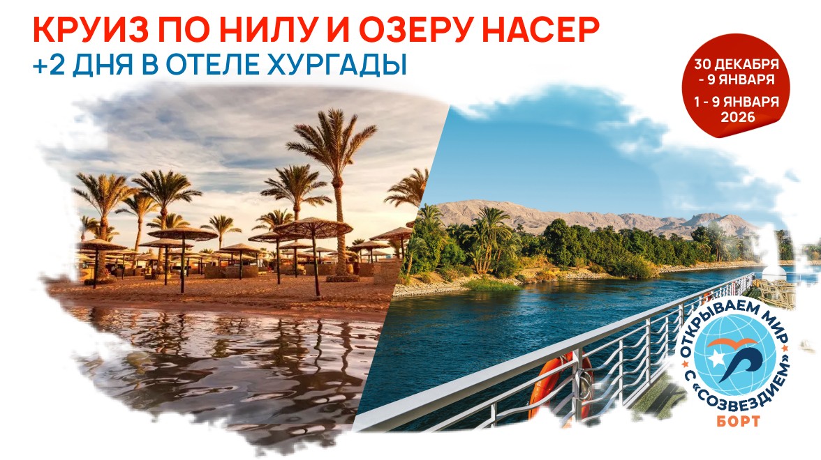 - 30 декабря 2025 - 9 января 2026 – «Классик-круиз + озеро Насер» + 2 дня до круиза в 4* отеле Хургады по системе «все включено»;