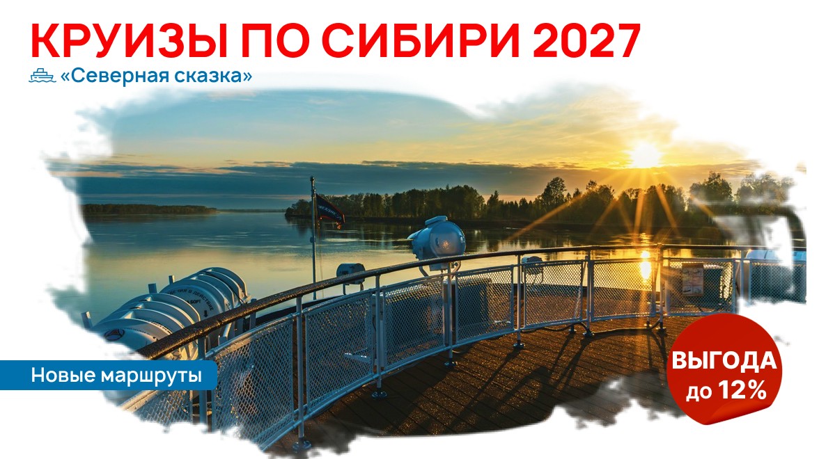 Могучие реки Обь, Томь и Иртыш образуют самую длинную речную систему России. Отправляясь в круиз на комфортабельном теплоходе «Северная сказка», вы пройдете по нетронутым сибирским просторам и сможете ощутить подлинное величие этого загадочного региона. Продажи навигации 2027 открыты!
