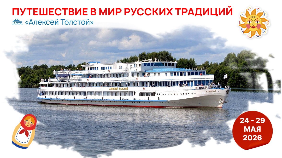 С 24 по 29 мая 2026 приглашаем вас в необычное путешествие для всей семьи. Прикоснитесь к истокам русской культуры и традиций в тематическом круизе «А-ля Рус» на комфортабельном теплоходе «Алексей Толстой».