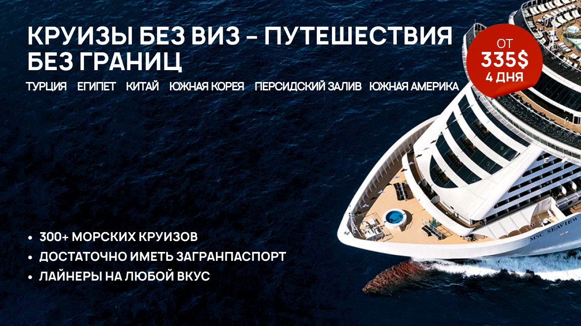 В базе круизного центра «Инфофлот» для вас – большой выбор безвизовых маршрутов, в том числе с русскоговорящими группами. Чтобы отправиться в круиз, достаточно иметь при себе загранпаспорт!